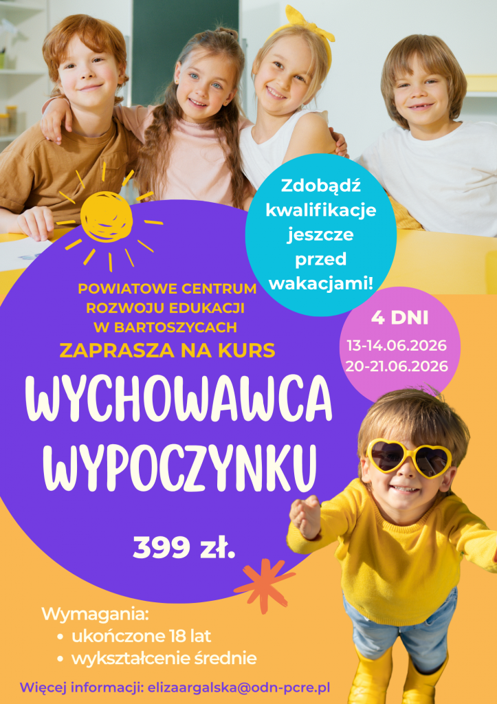 Zapraszamy na drugą edycję kursu WYCHOWAWCA WYPOCZYNKU!. Jeśli masz wykształcenie średnie i ukończone 18 lat, zdobądź nowe kwalifikacje jeszcze przed sezonem wakacyjnym!